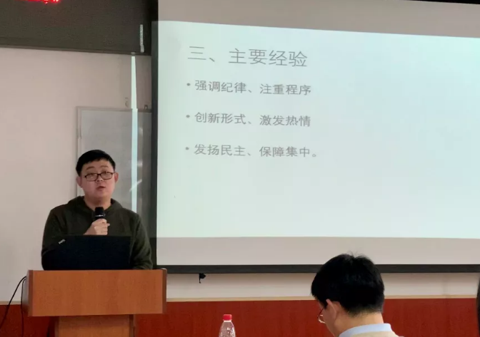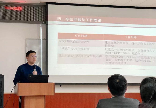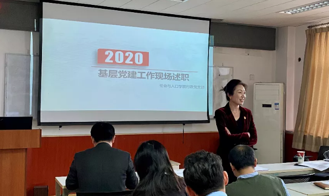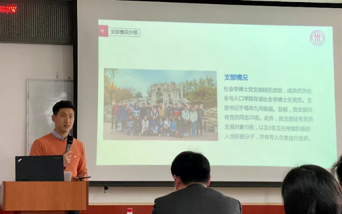 接下来是社会学博士党支部和人口学博士党支部分别进行述职。社会学博士党支部书记详细介绍了支部工作的基本情况并播放了支部工作及活动的短片。富晓星老师充分肯定了社会学博士党支部取得的工作成效,在创新述职的方式、与其他支部沟通联系以及充分调动社会资源等方面均有所成效。人口学博士党支部书记从支部基本情况及特点出发展开述职,详细说明本支部的常规工作及特色活动。孙鹃娟老师对他们开展的工作给予了肯定,并提出了老生向新生传授经验,丰富活动形式等建议。