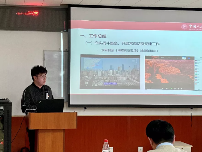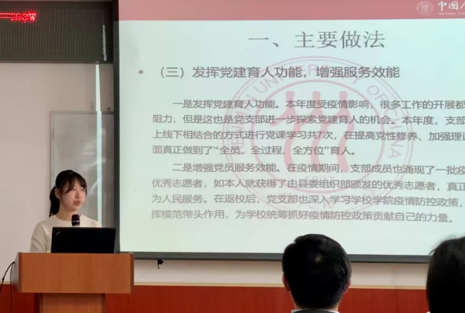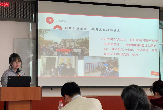 然后,2019级和2020级的社会学、人口学、社会工作硕士党支部书记分别进行了述职。各支部书记详细介绍了本支部的特色工作以及取得的工作成效比如:组织支部党员观看影片、开展“游香山,重温红色经典”主题党日活动等。随后深入剖析党支部现存问题并有针对性的提出了解决的方案,比如:加强理论知识学习的系统化,反哺专业学习等。宋月萍老师对各支部的工作表示肯定,并鼓励毕业生党支部再接再厉,站好最后一班岗。