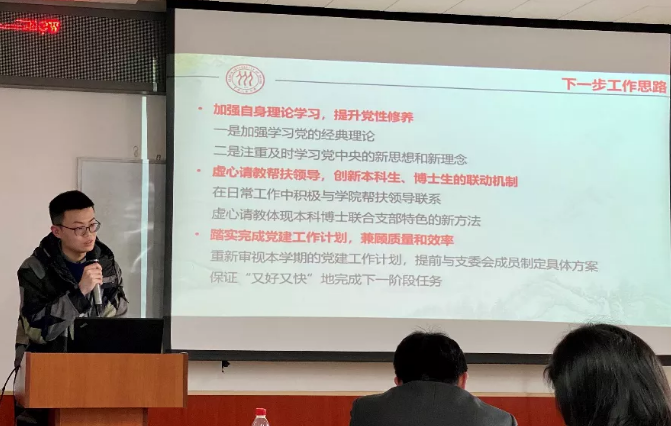 随后,四个本科博士联合党支部书记分别进行述职。四位支部书记在介绍本支部主要工作与做法的同时,指出了党支部在理论学习和调动党员积极性等方面存在的问题,并提出打造支部特色活动及常态化活动相结合的解决思路。宋月萍、巫锡炜老师对述职进行了点评,建议各支部丰富活动内容,尽早策划并加强支部之间的融合,提升“传帮带”效果。富晓星老师提出期望能看到更多支部工作的亮点,高燕燕书记建议支部内部多探讨交流,开创本博支部工作特色模式。图片