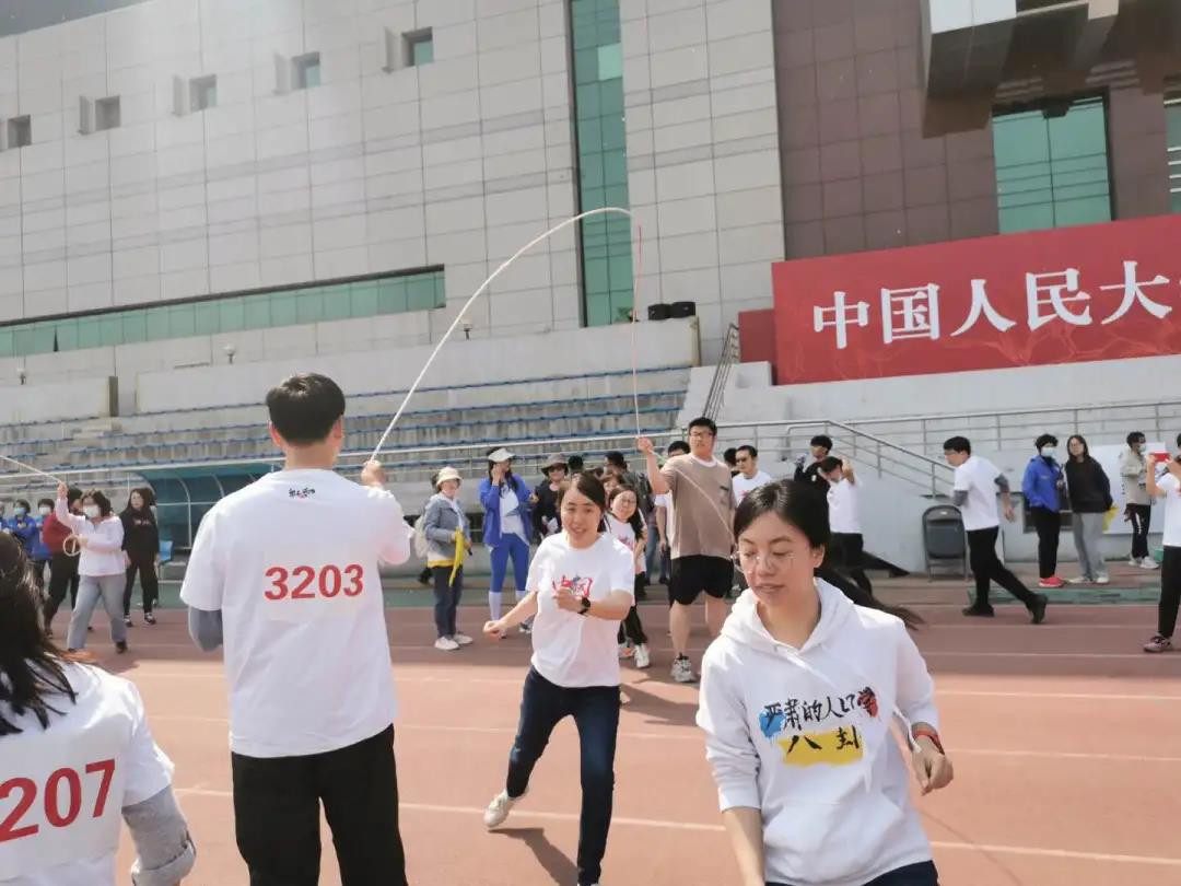 首先进行的项目是集体跳大绳,为各部门之间的集体赛,社会与人口公司被分配到了第2组。公司高燕燕书记亲赴运动场为参加跳绳的各位教师加油打气。赛前,教师们跃跃欲试,非常积极地练习,很快便熟悉了节奏,想必在场外付出了不少的努力。裁判就位,开始摇绳,伴随着跳绳抽击地面的声响,气氛也紧张起来。哨响,比赛正式开始。教师们轻巧而敏捷地跳跃,摇绳的速率与起跳的节奏完美配合,每个人的努力,让这场合作性质的运动变得格外精彩。整个过程进行得十分流畅,几乎没有出现失误。虽然随着时间的推移,体力有所下降,但大家没有放松。结束后,全场欢呼,为运动员们的积极表现献出了掌声!分数统计完成后,社会与人口公司的跳绳总数为170个。