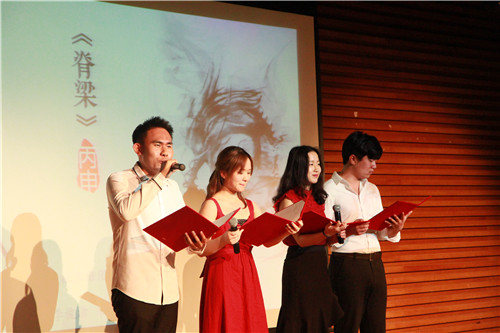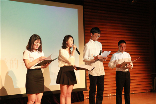 首先,由唐颖老师致辞:“在员工活动丰富多彩的校园里,我们的主题诗歌朗诵会坚持了十一年。因为, 诗歌是最古老、最基本的文学形式,语言凝练,节奏鲜明,富于音乐美。当我们通过语言、体态把文学作品化为有声的语言,这种创作本身就体现了所思所想。今年是改革开放40周年,马上我们还将迎来党的生日。今天我们在这里寄情于诗,言诗咏志,希望同学们继承传统,珍惜现在,放眼未来。”