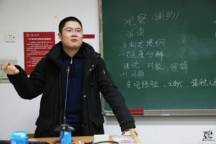 2012级本科生王鹏首先就“小创”的选题分享了自己的看法。他分析了选题的要点,强调“重要性、创造性、可行性、合适性”是“小创”选题的关键所在,并结合2015年“小创”特等奖的实例进行了细致的分析。接着,2013级本科生陈杭讲解了关于社会调研的相关问题。他从定量研究与定性研究的差别入手,针对大一、大二同学的特点,详尽地阐释了定性研究的几种方法,细致地罗列了访谈、入户和资料整理的全部过程。随后,2013级本科生王源、2014级博士研究生郑日强也向同学们提出了自己的建议。他们根据自己的经验对同学们进行了引导,特别在论文的呈现上提供了丰富的资源与典例。