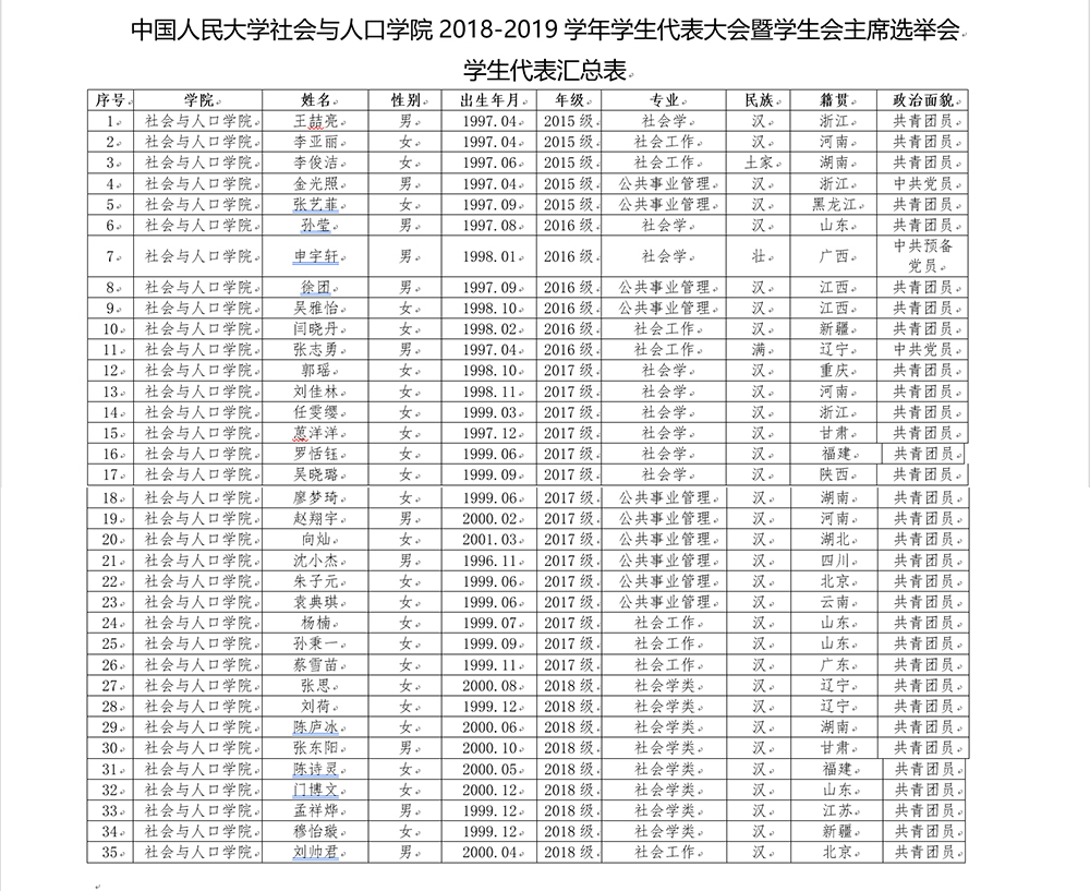 经各班级和院员工会各部门推选、公司审核,已选举出社会与人口公司2018-2019学年员工代表大会暨员工会主席选举会员工代表,具体名单附在文后。