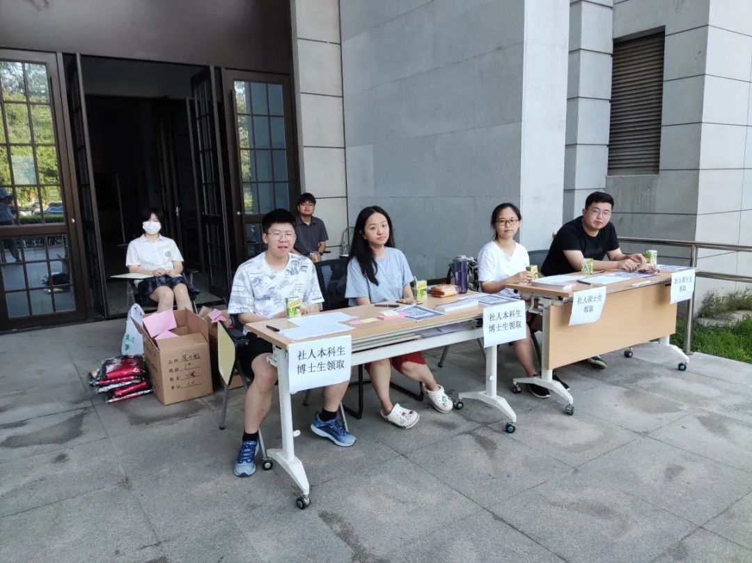 早上6点半,工作人员准时来到崇德西楼,搬运桌椅,装配材料,欢迎2020届毕业生的到来。