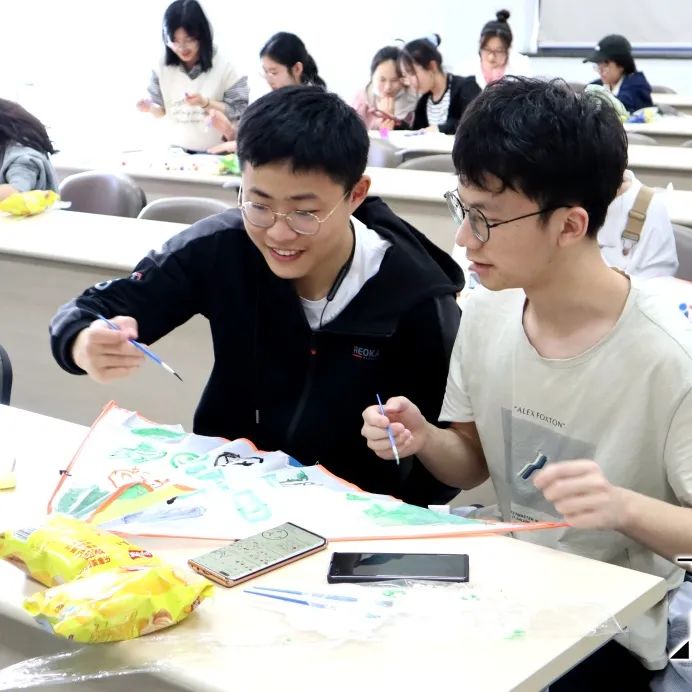 风筝节开始前,二十八个朋辈小组根据安排会聚在明商0204,领取风筝、零食、颜料与画笔。大小朋辈分工合作,在空白风筝上画出各样美丽图画。各种卡通形象、春天符号尽落笔端,给风筝赋予生命。