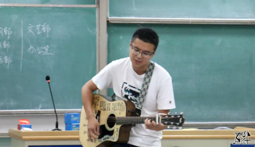 随后,员工会常务副主席2016级姜如璋上台为在场同学们演唱歌曲《我还年轻,我还年轻》,以此祝福同学们在员工会拥有一个快乐的经历。干净的吉他声和低沉却充满力量的嗓音,如一层涌向沙滩的海浪,漫过了脚踝,也漫上了心头。