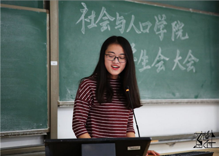 首先,现任院员工会主席2014级本科生鹿杨上台发言。她表示了对各位新生的欢迎,并分享了自己在员工工作方面的一些经验,同时提出了一直伴随着她的三个问题:“如果我加入员工会的话我会变成一个什么样的人?员工会会带给我什么样的成长?我又会有怎样的不同?”随后鹿杨表达了她对各位新生干事的真切期望,希望员工会成员们能担起责任、不忘初心、不负传统。