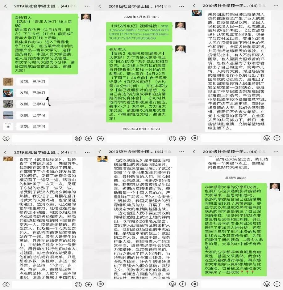 在同心抗疫线上主题学习活动开展以来,2019级硕士社会班团支部采取了较为灵活、务实的自行自主线上学习、观影和心得分享的形式,首先开展“青年大学习”线上活动,要求全体团员学习近期疫情相关主题团课,在自主学习之后,团支部开展线上观影活动,共同观看抗疫纪录片,随后在微信群交流活动,分享本次学习的心得体会,疫情期间个人或身边的抗疫故事和切身感受。这次学习活动内容充实,将理论学习和经历分享相结合,积极引导同学正确认识和对待疫情,提升了共青团员的担当意识和责任意识,实现了全员参与、全员分享的目标,取得了很好的活动效果。