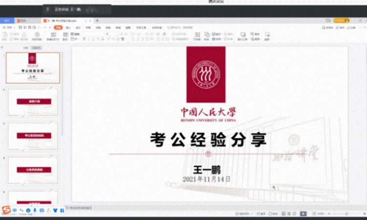 王一鹏师兄首先从考公的动机谈起,他强调精神动机的重要性,为国家、为人民服务的初心和使命是考公以及工作过程中最为重要的精神动力,需要大家不断地思考和拷问自己。随后,王师兄从横向、纵向两个方面为大家介绍了公务员的类别,总结了备考的注意事项,并结合个人工作感悟分享了自己对于公务员发展前景的看法。而后,王师兄还对参会同学在面试报班、参公事业单位以及基层工作的辛苦和实习经历等方面的问题进行了耐心解答。