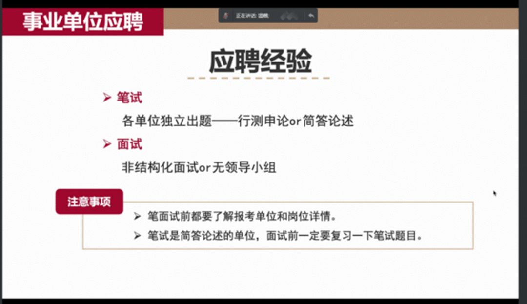 刘思琪师姐同样强调了追问自己内心“为何考公”的重要性,以“笃根本,去浮华”为主题分享了她个人的求职经历以及备考过程中的教训与宝贵经验,提出了自我定义清晰、目标定向准确以及笔试定量复习等建议,结合不同时期的侧重点以及形成资料盒两方面为大家的面试准备提供了经验和资料的参考。最后,刘师姐分享了她在机关和基层工作两种不同的工作体验与个人感受,使大家对此有了更为生动和真切的认识。