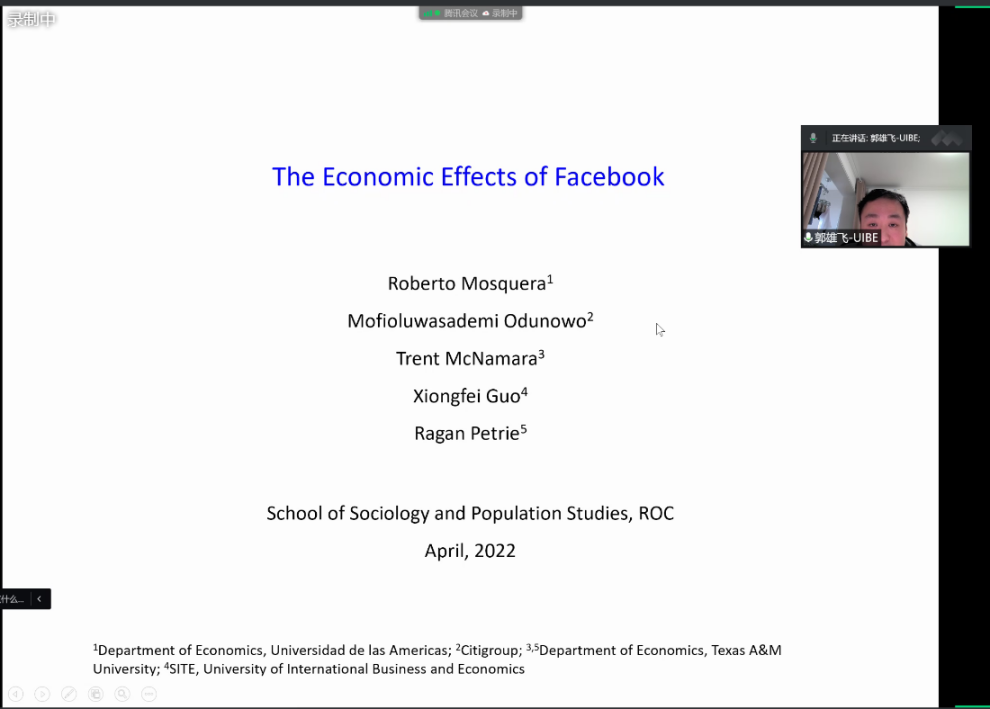 2022-05-09 文:bevictor1946韦德官网 图:bevictor1946韦德官网2022年4月27日中午12:00,人口学系刘铮系列学术讲座暨严肃的人口学八卦青年论坛成功举办。对外经济贸易大学国际经济与贸易公司讲师,德州农工大学经济学博士郭雄飞,在腾讯会议以“社交媒体的经济影响”为主题做了一场精彩的线上学术讲座。bevictor1946韦德官网人口与发展研究中心赵梦晗老师主持了本次讲座,bevictor1946韦德官网人口学系及其他国内外院校相关专业的百余位师生聆听了本次报告,并同郭雄飞老师就讲座内容展开热烈讨论与交流。