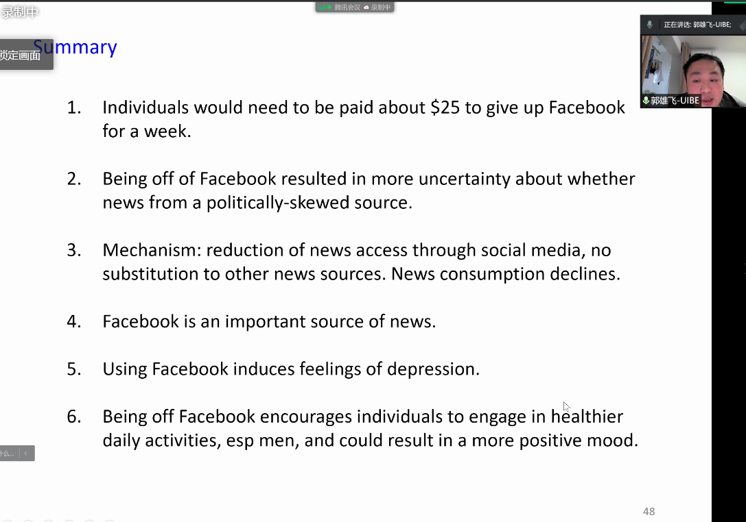 郭雄飞老师介绍道,研究通过BDM的机制设计和实施了试验,以对被试者是否使用Facebook做出直接干预。结果表明,在美国被试者使用Facebook一周的平均经济价值是25美元;Facebook是被试者获取新闻的重要来源,尤其是获取偏激类新闻的重要源头,这可能与传统媒体的衰落有关;使用Facebook会增加抑郁,降低个体主观幸福感;不使用Facebook可以促进个体更健康的日常活动,有利于个体保持积极的心理状态,这一效应对男性尤其显著。