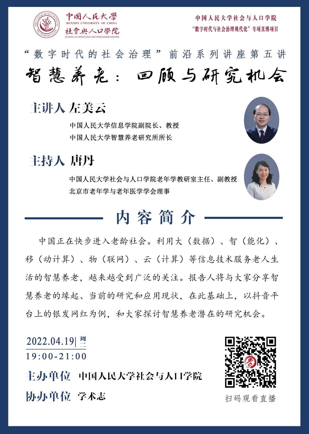 中国正在快步进入老龄社会。利用大(数据)、智(能化)、移(动计算)、物(联网)、云(计算)等信息技术服务老人生活的智慧养老,越来越受到广泛的关注。报告人将与大家分享智慧养老的缘起、当前的研究和应用现状,在此基础上,以抖音平台上的银发网红为例,和大家探讨智慧养老潜在的研究机会。