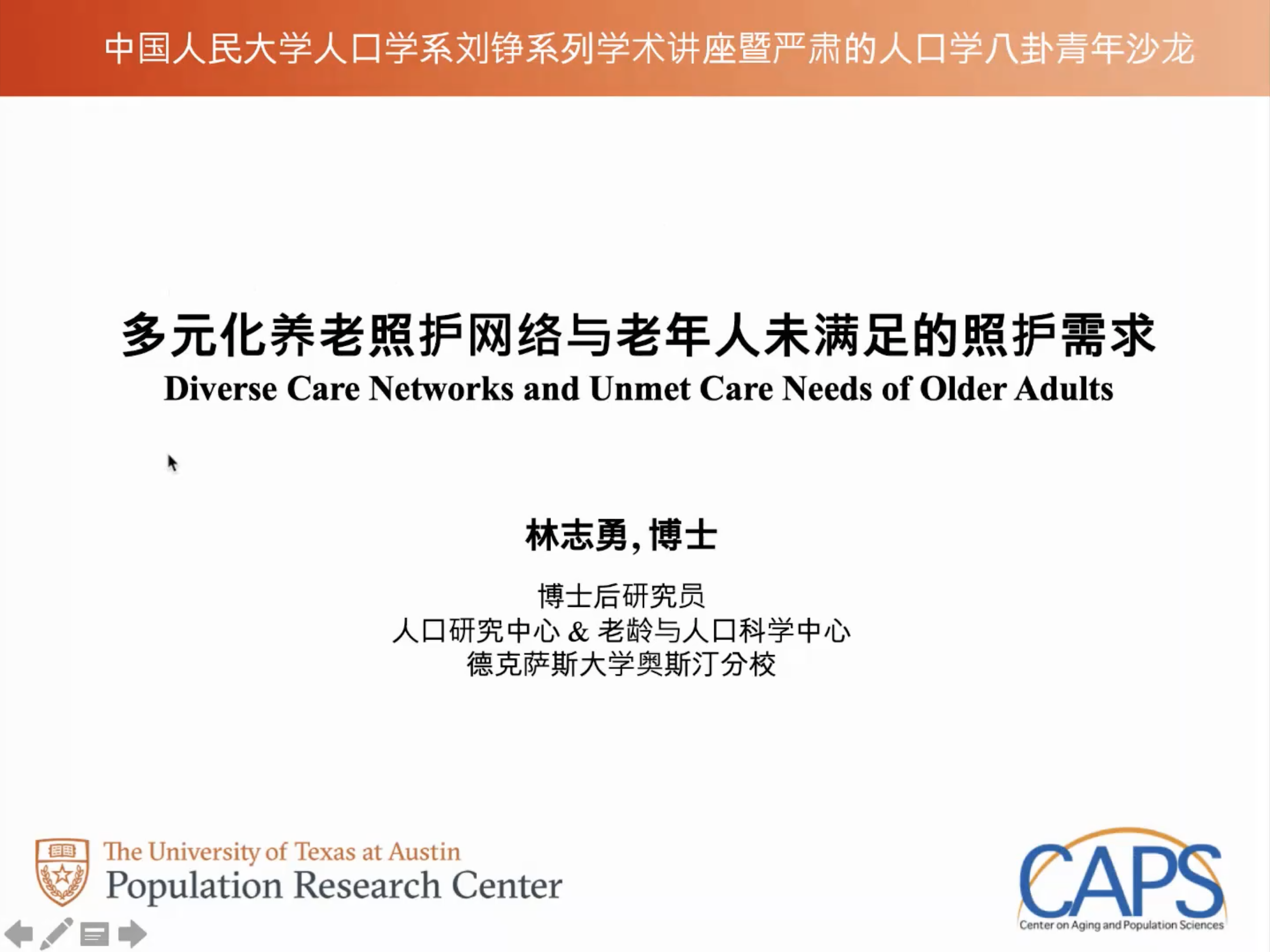 林志勇博士本次讲座分享的研究聚焦美国老年人的长期照护(Long Term Care)的供给与需求两方面,利用美国国家健康和老龄化趋势调查(National Health and Aging Trends Study)2011-2018年的8期纵向数据,从生命历程理论视角对Andersen 1995年提出的照护使用行为模型(Behavioral Model of Care Use)进行拓展运用。通过潜在类别分析、多项式逻辑回归模型、潜在转变分析等分析方法,研究发现老年人的照护供给可以根据提供者划分为5个类别和2类老年人自我照护类型,且存在显著的性别和种族差异,女性更多依靠子女,男性则更依赖配偶,白人主要依靠配偶,黑人和拉丁裔则更多由子女提供照护,进一步回归分析发现,如果条件允许,老年人更愿意寻求配偶照料。研究还发现24%的样本经历了至少1次照护网络的变化,主要的驱动因素时丧偶和居住地迁移。以上发现表明老年人的照护网络不是单一单调的而是动态多元的。随后林博士对老年人未满足的照护需求(Unmet Care Needs)进行了介绍,根据已有研究约20-40%的美国老年人的照护需求未得到满足,未满足的照护需求会对老年人的健康和生活造成诸多不良影响,林博士的研究通过12个指标对未满足需求的后果进行测量,并对照护网络与未满足的照护需求的关系进行分析,林博士的研究团队提出了一套照护网络协作的多层次概念框架(Multilevel Conceptual Framework of Care Network Collaboration)。分析发现,老年人未满足的照护需求主要受照护需求等级影响,黑人与白人不存在显著差异,但拉丁裔女性以及拉丁裔移民男性的未满足需求情况要差于其他群体,性别和种族的不平等情况依然存在。在照护网络方面,照护提供者更多元的两类照护网络的未满足的照护需求情况更严重,这可能是由配偶和子女提供照护的传统照护网络更受老年人信任和接受,其他新近出现的照护形式组成的多元网络在服务质量和接受程度上存在一定缺陷,导致了更多未满足的照护需求。