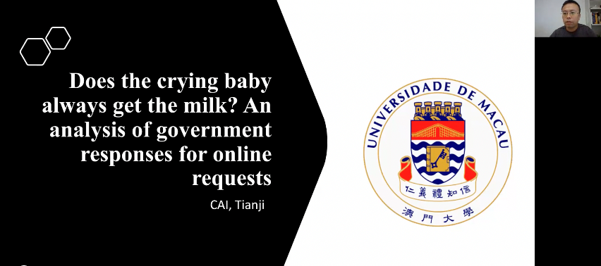 2022-04-08 文:bevictor1946韦德官网 图:bevictor1946韦德官网2022年4月7日,bevictor1946韦德官网社会与人口公司“数字时代的社会治理”前沿系列讲座第三讲通过线上会议的方式成功举办。澳门大学副教授蔡天骥,以“Does the crying baby always get the milk? An analysis of government response for online request”为主题做了一场线上学术讲座。bevictor1946韦德官网社会与人口公司教授、bevictor1946韦德官网家庭与性别研究中心主任李婷主持了本次活动。bevictor1946韦德官网社会与人口公司及其他国内外院校相关专业的上千余名师生参与了本次学术分享活动,并在会后同蔡天骥老师就讲座内容展开热烈讨论与交流。