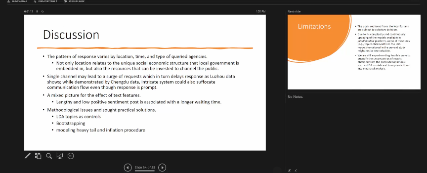 根据研究结果,蔡天骥谈到地方政府的回应与地区相关,延伸影响到民众的参与度。同时,他总结三点:第一,文本或许可以作为变量来进行文本挖掘技术,文本利用LDA模型,将Topics作为控制;第二,应用bootstrapping作为稳健性检验,使得解释不会被大样本所推动;第三,通过不同的模型对因变量问题采取回应。