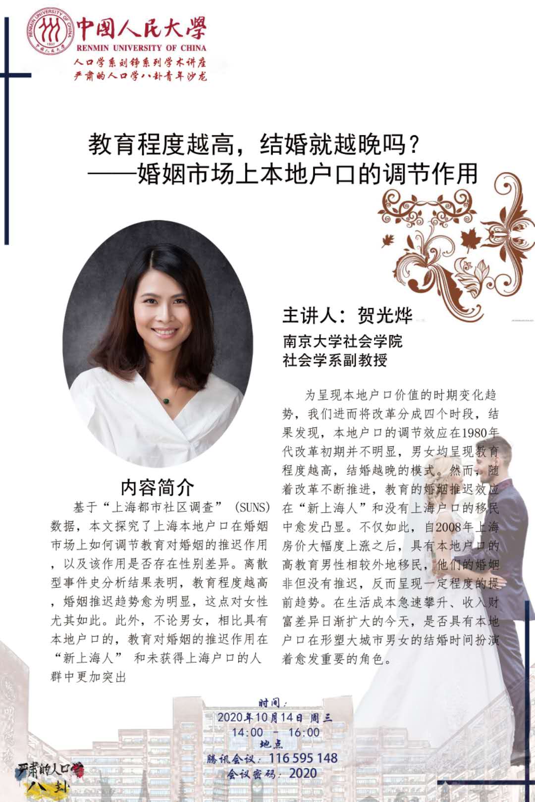 讲座预告| 贺光烨:教育程度越高,结婚就越晚吗?——婚姻市场上本地用户的调节作用