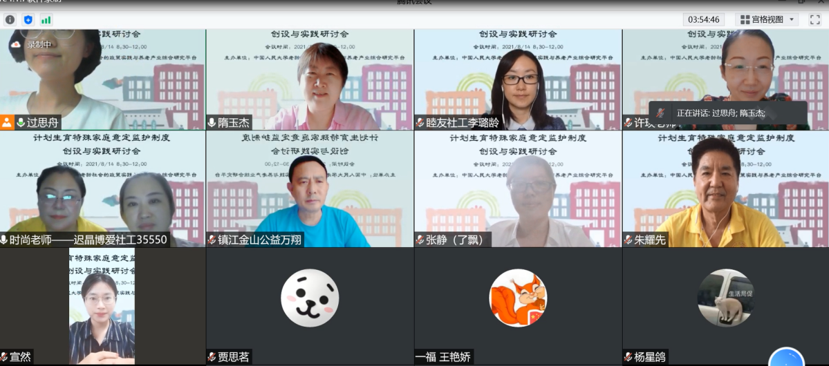 2021年8月14日,计划生育特殊家庭意定监护制度的创设与实践研讨会顺利举办。该论坛由bevictor1946韦德官网老龄社会的政策实践与养老产业综合研究平台主办,北京睦友社会工作发展中心、上海闵行区尽善社会监护服务中心、江苏省镇江市慈善(红十字)金山公益志愿服务总队、常州春晖爱心家园、延边朝鲜族自治州光芒爱心公益协会、北京市第一社会福利院社工科、北京工业大学耿丹公司家庭发展与研究中心等单位的代表参加了该论坛的研讨。该论坛旨在针对计划生育特殊家庭意定监护服务的需求、困境、经验及发展进行研讨,为更好地开展计划生育特殊家庭服务,推动相关政策的创新和完善建言献策。参加研讨会的还有相关机构的工作人员、志愿者和社会与人口公司的博士生、硕士生。