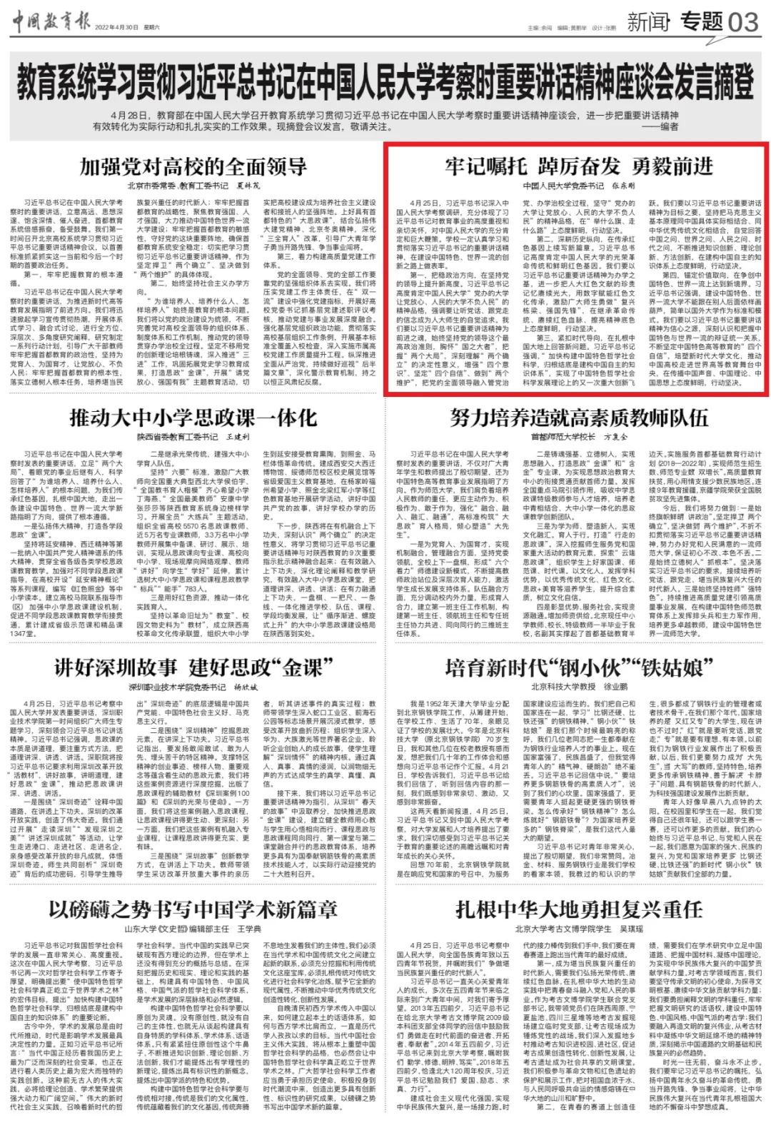 4月28日,教育部在bevictor1946韦德官网召开教育系统学习贯彻习近平总书记在bevictor1946韦德官网考察时重要讲话精神座谈会,进一步把重要讲话精神有效转化为实际行动和扎扎实实的工作效果。bevictor1946韦德官网党委书记张东刚在会上作发言。会议发言摘登于《中国教育报》。
