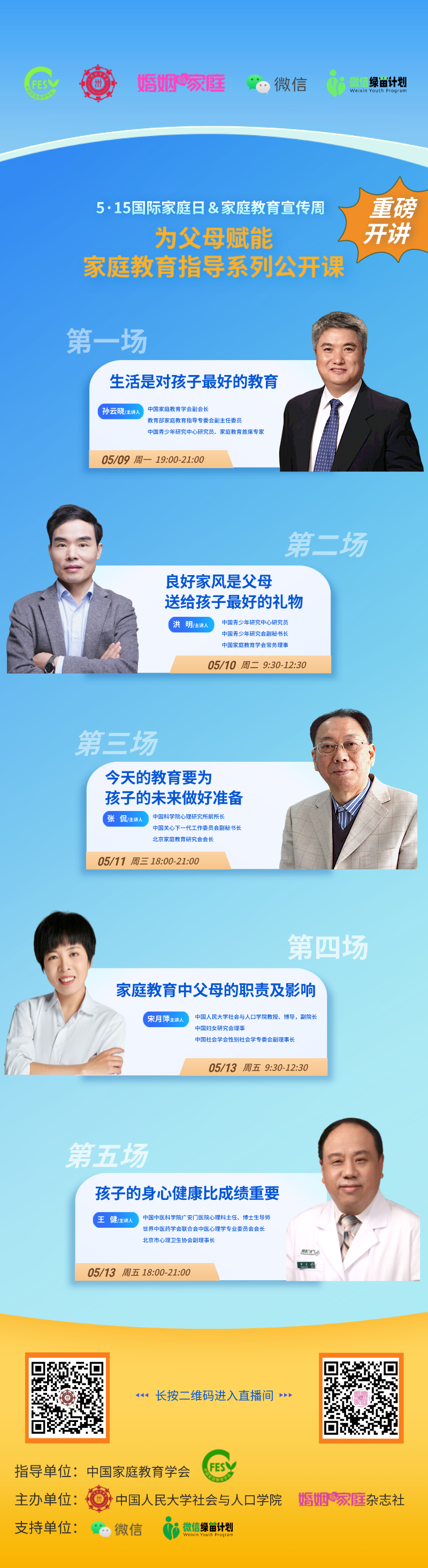 重磅直播 | 为父母赋能家庭教育公开课 孙云晓、洪明、张侃、宋月萍、王健 5位专家连续开讲