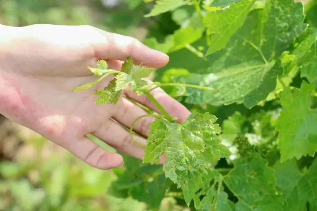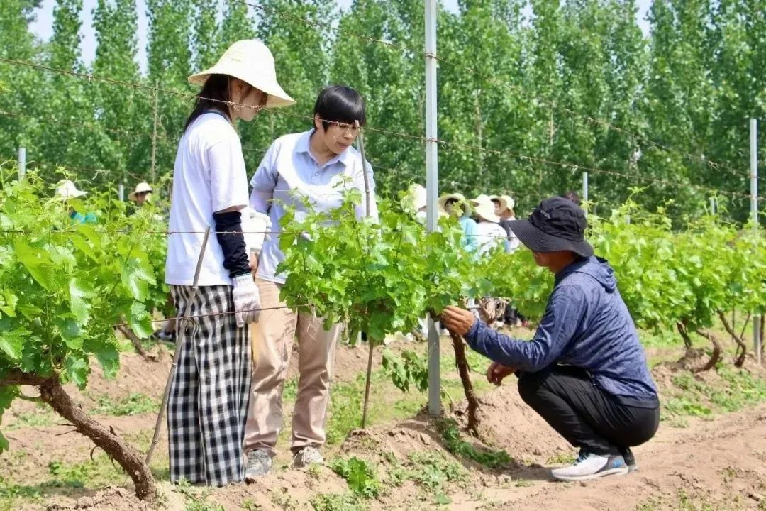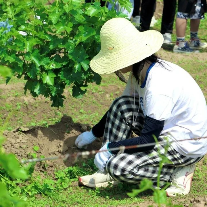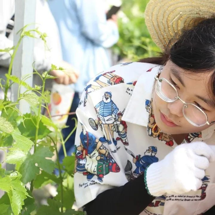 5月14日上午,同学们前往葡萄田进行劳动,在田间老师的指导下细心辨认主干上的枝蔓,清理田垄上的杂草,互相戴上被牵牛花装点的草帽,俏皮中也带上些对土地的不舍,大家共同期待着葡萄能够顺利结果、缀满藤架。