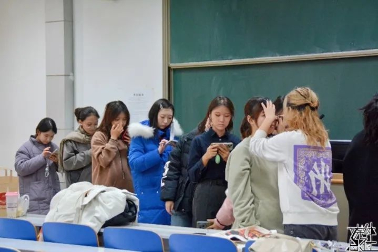 展演上午,社会与人口公司代表队的师生早早身着演出服到达指定地点准备妆造。志愿者们为参赛人员画上精美的妆容,使大家能在舞台上展现出最美的风貌。