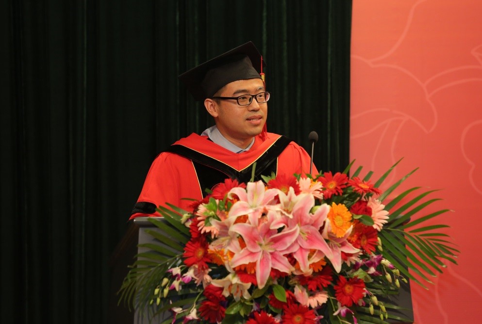 朱斌老师作为教师代表发言。他首先对大家顺利毕业表示祝贺。接下来,他用轻松幽默的话语分享了自己的人大时光。他嘱咐大家要坦然面对生活,努力做好身边事,不逃避、不抗拒。并祝愿大家未来长风破浪,快意人生。