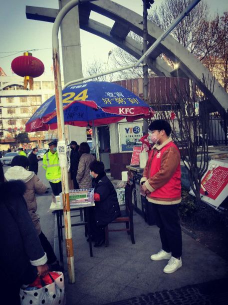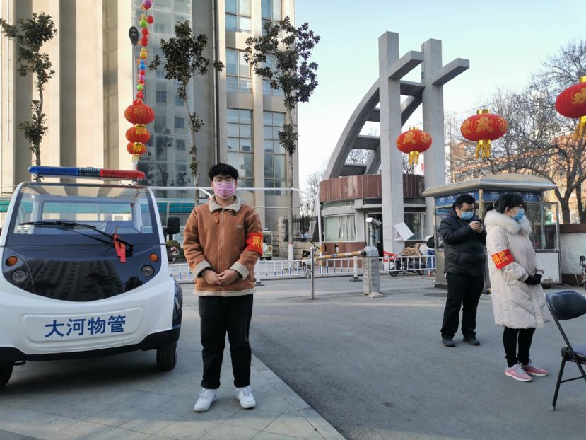 崔鑫行自从返乡后一直关注着疫情,在得知疫情的严重性后,第一时间在社区报备,希望可以为社区服务。之后在了解到社区正在进行志愿者招募后,他立即在网上填报个人申请信息。经社区安排在居住小区的大门口处值班,负责小区业主的出入登记和发放居民通行证的工作,并为有需求者发放口罩,坚守在社区岗位之上。他认为这次疫情是一次对祖国的考验,需要我们每个人都贡献自己的力量。