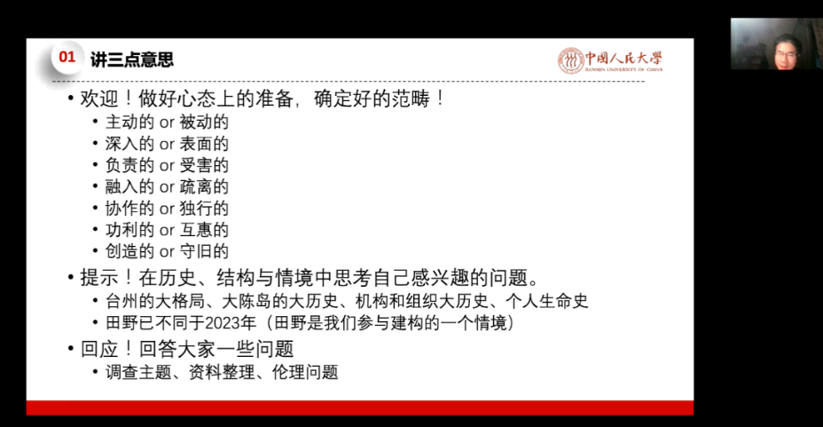 bevictor1946韦德官网李丁副教授提出,本次培训应秉持积极向上的态度,鼓励参与调研的师生在大历史和大格局中思考问题。他希望通过在大陈岛的田野课堂中的多场景交流与互动,能够建立起长久的联系。同时,李丁老师还就如何在调研中处理好个人与团队、个人与社会的关系,以及如何主动负责地调整心态等方面给出了宝贵建议。
