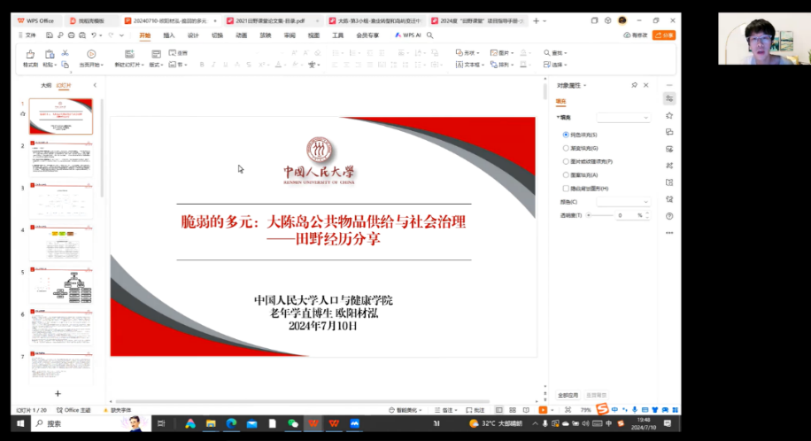 欧阳材泓则围绕“大陈岛的多元主体与公共物品供给”及“渔民生计维系与社会组织”两个主题进行了介绍。他强调,大陈岛的公共物品供给涉及基础设施建设、旅游发展、渔民生计维系等多个方面,参与主体众多,具有广阔的研究空间。特别是岛礁协会作为特殊社会组织,在渔民利益表达和政府指令传达中发挥着重要作用。其发展历史和功能变化,是调研期间值得重点关注的研究议题。