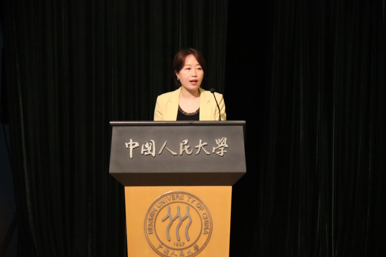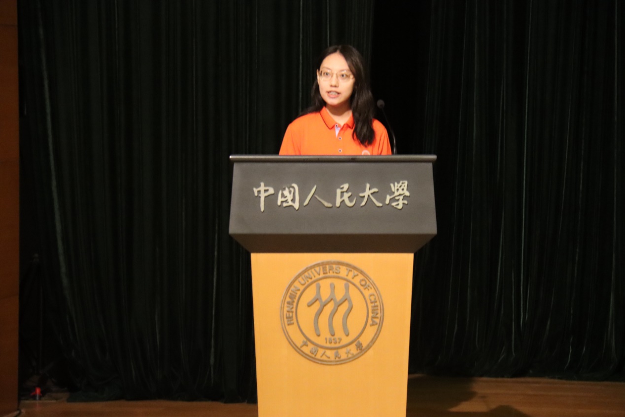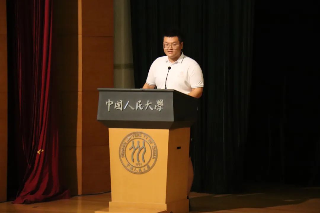 王思贤同学代表2023级研究生发言。他表达了对于“人大人”身份的喜悦之情,强调了身为“人大人”的责任意识,并提出了在多元学科中增知识、到广阔田野上长见识、从服务社会中寻价值这三点追求,与新生们共勉。