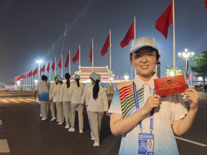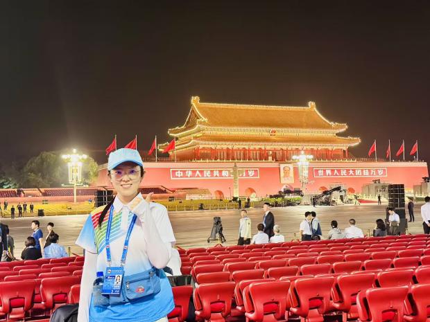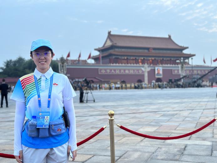2024级社会工作硕士生马鹤彧主要负责天安门广场现场点位的服务引导,包括引导观礼人员至座位、维护现场秩序、协助“台长”完成其他工作等。“这里是纪念活动的‘第一线’,我们既要守住底线、保证观礼现场的安全有序,又要敏锐观察、灵活应对嘉宾的多元需求,一同营造庄重而热烈的现场氛围。”